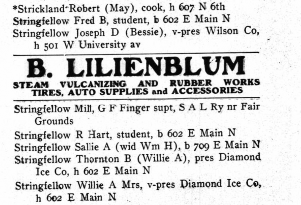 Two years later, T. B. Stringfellow returned to Gainesville, where he founded and served as president Diamond Ice Company, an important business enterprise which in addition to the Gainesville plant included another plant at Alachua and the Fruit Growers Ice Company at High Springs. In 1917, Stringfellow became president of the Sweet-Water Mills in Gainesville, manufacturers of old-style stone-ground corn meal, flour, rice, and grits, and in 1922 he became president of the Gainesville Buick Company, handling Buick automobiles, with a branch plant at Palatka. His third son, Jack Boyd, worked with him at the Gainesville Buick Company, while his youngest son, Arthur King, was associated with his wholesale grain and feed business. In addition to these activities, T. B. founded in the 1920s University Realty Company and Stringfellow & Hutchinson Company, a wholesale grocery. When he died in 1945, six months after his wife Willie, T. B. Stringfellow, age 86, was hailed by the Gainesville Daily Sun in his obituary as a prominent resident who became highly interested in civic affairs and who owned valuable property both in Jacksonville and Gainesville for many years. Although his daughter Marguerite Stringfellow, age 56, then of Tampa, was listed as surviving him, understandably there was no mention of his first marriage with Ernestine Broome or his killing of Charley Pratt more than fifty years earlier.