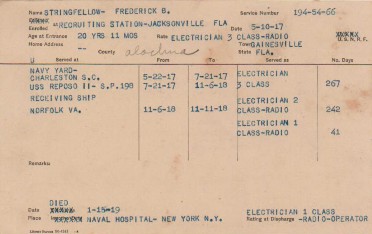 Meanwhile, Fred Stringfellow completed his studies at Riverside Military Academy in Gainesville, Georgia, which had a naval department with instruction in the use of wireless radios. On May 10, 1917, a little more than a month after the U.S. declared war on Germany, he enlisted in the United States Navy at the recruiting station in Jacksonville and was given the rank of electrician third-class, radio operator. After two months of basic training at the Navy Yard in Charleston, South Carolina, he was assigned to duty on the USS Reposo II (Section Patrol craft #198). Originally built in 1882 by the Greenpoint Basin and Construction Company, Greenpoint, Long Island, New York, as the private yacht Sophia, she was rebuilt in 1902 and renamed Empress, later Onondaga, and subsequently Turbese, until May 12, 1917, when she was acquired by the navy and commissioned USS Reposo II. Only 140 feet long, with top speed of 14 knots, and an armament one 3-pounder cannon, two machine guns and one Y-gun depth charge projector, Reposo II had a ship’s complement of eighteen. Reposo II patrolled the coastline between Key West, Florida and Brunswick, Georgia, into 1918, before remaining at anchor in the Charleston Navy Yard from May to December 1918, when she was later decommissioned. While aboard Reposo II, Stringfellow was promoted twice, to electrician second-class after 267 days and as electrician first-class 242 days later.
