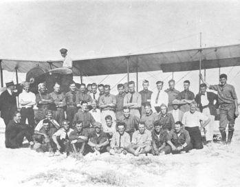 Aviation Section, U.S. Signal Corps, Enlisted Reserve Corps, A.E.F., training at No. 2 School of Military Aeronautics in Oxford, England, in the Royal Flying Corps, September-October, 1917. Sergeant DeGarmo is standing second row back, fourth from the left (enlarged, right). Lieutenant Dwyer is seated in the middle.