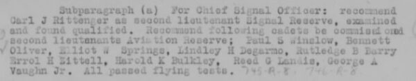 Memo recommending that Lindley H. DeGarmo, Elliott White Springs, and other RFC cadets be commissioned second lieutenants, dated January 29, 1918, having “passed flying tests.” Approved by General Pershing on February 8.