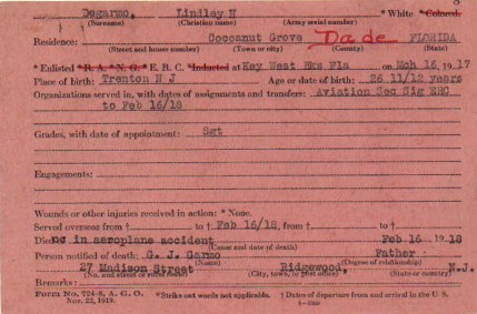 A month earlier, some 44 veterans in Coconut Grove, Florida, formed a new American Legion post which they named in Lindley DeGarmo’s honor. In April 1921, George DeGarmo donated the flag used to drape his son’s coffin to the post. About the same time, his cousin, Dr. Charles DeGarmo, wrote the following poem in his memory: