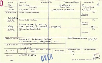 On February 19, 1918, Cadet Lindley H. DeGarmo, 28 years old, was laid to rest in Grave 24, Plot E, St. Albans (Hatfield Road) Cemetery, near the ancient Cathedral and Abbey Church in St. Albans, Hertfordshire, England. The whole squadron attended his funeral which was full of military honors, his coffin draped in an American flag and conveyed on a gun carriage. Meanwhile, someone packed up his personal effects into a trunk and suitcase and shipped them to DeGarmo’s parents, arriving several months later.