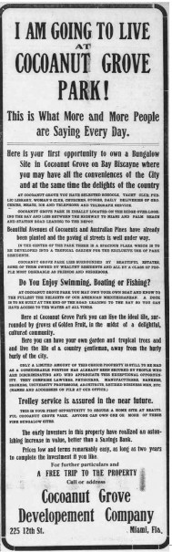 Cocoanut Grove Park, located between the highway and Douglas Road, was one of Coconut Grove’s first planned subdivisions, platted and designed in 1910 by Lindley DeGarmo’s cousin.