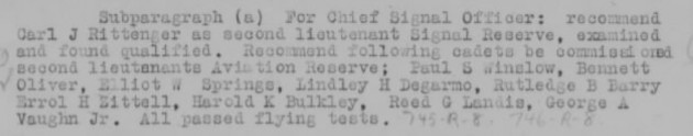 Memo recommending that Lindley H. DeGarmo, Elliott White Springs, and other RFC cadets be commissioned second lieutenants, dated January 29, 1918, having “passed flying tests.” Approved by General Pershing on February 8.