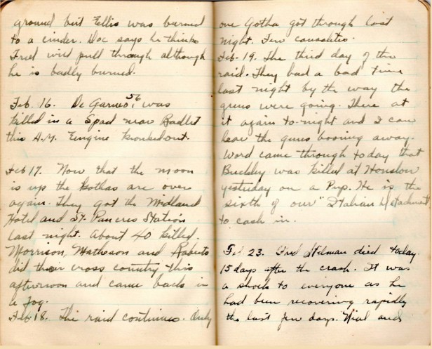 Diary entry of February 16, 1918, documenting the death of L.H. DeGarmo of Training Squadron No. 56, by Jesse Frank Campbell of Royal Oak, Michigan, another cadet.