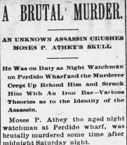 Seven years later, on February 7, 1897, Moses Leonard (Dick) Morgan was born in an area later known as Gull Point, Florida, the youngest of six children of Delaney Leonard (Len) Morgan (1855-1924) and Georgiana Athey (1860-1940), who were married in Pensacola on October 7, 1881. And though he never knew his father’s older brother Richard, he would proudly take his nickname Dick. He was also named for his maternal grandfather, Moses Prescott Athey (1823-1899), a native of Montgomery, Alabama, who had relocated to the Florida Panhandle in the 1840s and had lived in Santa Rosa County until the 1880s, before moving to Pensacola. Moses Athey too would suffer a violent death on July 15, 1899, around midnight, when as a night watchman at the Perdido wharf, where vessels were docked, an unknown assailant crept up behind him and smashed his head with an iron bar, crushing his skull. Authorities blamed his murder on either a gang that had been in the area robbing freight cars or a black man against whom Athey had testified in police court recently. But both leads resulted in no arrests and his murder went unsolved.