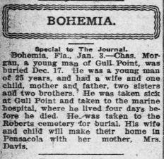 Story about Moses Leonard (Dick) Morgan’s grandfather, who was also murdered. Pensacola News, 7/17/1899.