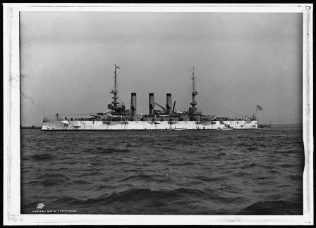 Built by the Newport News Shipbuilding & Dry Dock Co. at Newport News, Virginia, Louisiana was laid down in 1903, launched in 1904, and commissioned in 1906. Although she took part in the world cruise of the Great White Fleet (1908–09) and a pair of trips to European waters (1910-11), she primarily operated along the east coast of the United States and in the Caribbean during her career. Between July 1913 and September 1915, Louisiana made three voyages from east coast ports to Mexican waters, her second voyage in 1914 coming at a time when tension between Mexico and the United States was at its peak. Returning from the Gulf of Mexico, Louisiana was placed in reserve at Norfolk, where she served as a training ship for midshipmen and naval militiamen on summer cruises. By June 1917, when Dick Morgan joined her crew, she was assigned as a gunnery and engineering training ship for gunners and engine room personnel, cruising off the middle Atlantic coast until September 1918. After the Armistice she saw duty as a troop transport, making four voyages to Brest, France, and bringing American troops back home. Following her final trip back from France, she reported to the Philadelphia Navy Yard, where she was decommissioned in October 1920 and was sold for scrap on November 1, 1923.