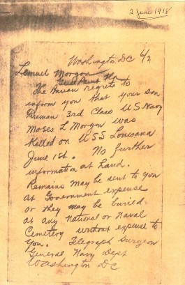 During routine gunnery practice on June 1, 1918, at about 10:46 a.m., a shell accidently fired from USS New Hampshire pierced the port side of Louisiana, killing one man and wounding several more, including Chicago-born Seaman Ladislaus (Slavek) Lukas (1896-1964), son of an Austrian tailor, who later worked as a cook for the Union Pacific Railroad based in Denver. The next day, Len Morgan of Gull Point, Florida, received an official telegram from the Navy Department in Washington, D.C., informing him that his son Dick Morgan was the one sailor killed.